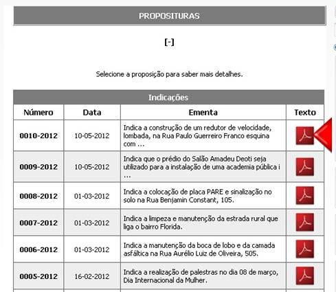 Selecionando o ano o usuário poderá ver a listagem de requerimentos feita naquele ano. O site traz também um trecho da ementa e o documento na integra para download.